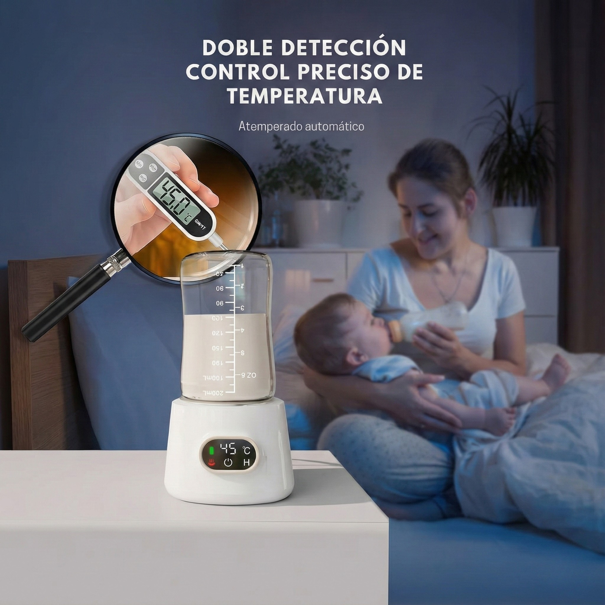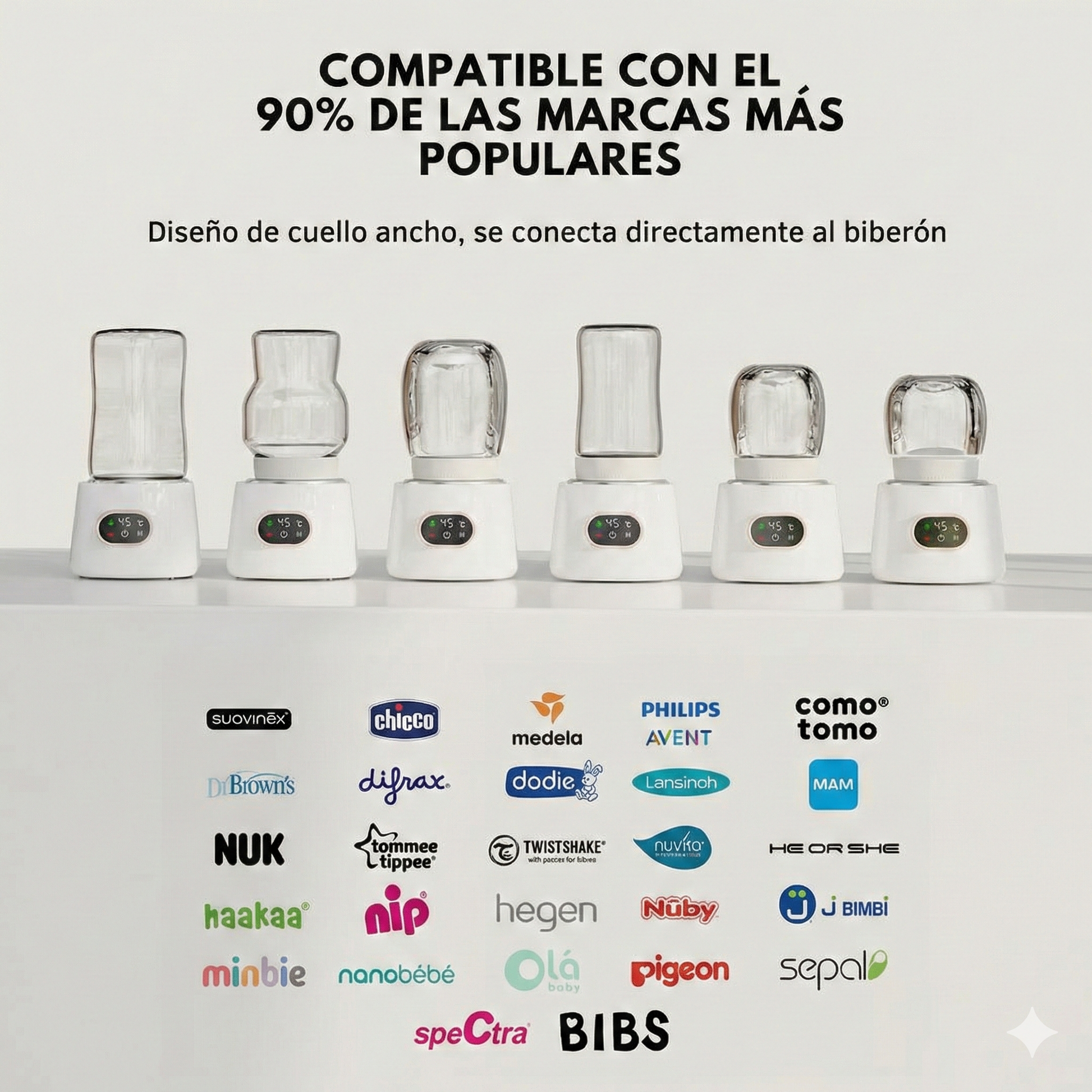 Con sus 4 niveles de temperatura ajustables, puedes calentar la leche o el agua justo a la medida que tu bebé necesita. Además, incluye adaptadores universales para diferentes tipos de biberones, asegurando compatibilidad y comodidad en cada uso.